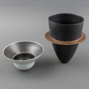 Ben Oldenhof (1955), zwart- en goudgeglazuurde keramische vaas, en witte keramische kom met uitlopende rand en zwart strependecor, zwarte vaas gedateerd '85, 23 × Ø 23 cm