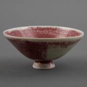 Ru de Boer (1920-2010), rood-grijs geglazuurd keramiek schaaltje op voet, 5,5 × 12,5 cm