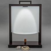 Tafellamp met gesatineerde opaline kap en donkergelakt houten frame, model Nao, ontwerp Chi Wing Lo, uitvoering Giorgetti, Italië -knop defect, houten draaiknop wel aanwezig-, 54 × 39 × 25 cm