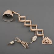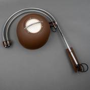 Metalen wandlamp aan uitklapbare dubbele boog, voorzien van bruine kap, uitvoering Dijkstra, jaren '70 -kap wat gedeukt-, ingeklapt 70 × 50 cm, kap Ø 29 cm