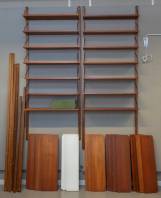 Teakhouten wandsysteem bestaande uit zes hoge muurbeugels, twee middellange muurbeugels, en drie kortere muurbeugels, 31 diverse maten planken waaronder twee witte, en diverse montagematerialen, ontwerp Paul Cadovius, uitvoering Royal System, jaren '60/'70 -gebruikssporen, twee staanders ingekort- langste muurbeugels 217 cm lang, grootste planken 80 × 24 cm