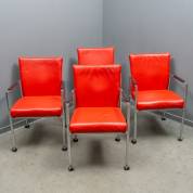 Vier armstoelen met rode lederen bekleding, de buisframes met wieltjes, 88 × 54 × 55 cm