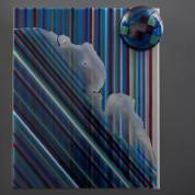 Frank van den Ham (1952), rechthoekig meerkleurig glaskunstwerk bestaande uit twee platen met strependecor en glazen bol, niet gesigneerd, 49 × 40 × 9 cm