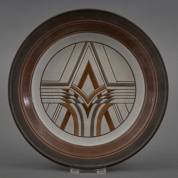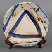 Sandy Brown (1946), geglazuurde keramiek schaal met polychroom decor met driehoek, gesigneerd in de schaal, Ø 29 cm