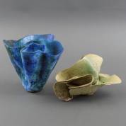 Hans en Gerda Heudorf, groengeglazuurd keramisch vormstuk en blauwgeglazuurde keramische vaas, jaren '80, Oostenrijk, 18 × Ø 28 cm
