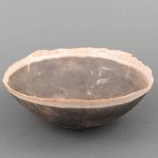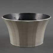 Beate Nieuwenburg-Reinheimer (1943), grijsgeglazuurde aardewerk kom met verticale banen in reliëf, en zwartgeglazuurde binnenzijde, gemonogrammeerd en gedateerd '85, 14 × 25,5 cm