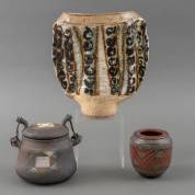 Drie keramische objecten: grove vaas met geglazuurd krullendecor, gemerkt HKO maar niet Harm Kamerlingh Onnes, dekseldoosje uitvoering Lozjite Daiva, en een vaasje met sgraffitodecor, jaren '60-'80, 21 × 22 × 9 cm
