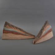 Johnny Rolf (1936), paar keramische vormstukken van geelbakkende klei met zwart, rood en blauw glazuur, gemerkt, jaren '80, circa 23 × 47 × 17 cm per stuk