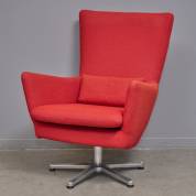 Loungestoel met rode stoffen bekleding op chromen draaipoot, in de stijl van Gerard van den Berg -stof klein beetje verkleurd-, 107 × 65 × 75 cm