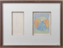 Olav Cleofas Van Overbeek (1946), abstracte compositie met cirkels en driehoeken, aquarel op papier, r.o. gesigneerd en gedateerd '94, 16 × 12,5 cm, samen ingelijst met een handgeschreven tekst: 'Moed, openheid en vertrouwen zijn de belangrijkste ingredienten om mens te worden'