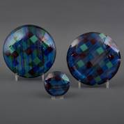 Frank van den Ham (1952), drie glazen bolvormige wandobjecten met grafisch vierkanten- en strependecor, niet gesigneerd, Ø 25 × 9 cm