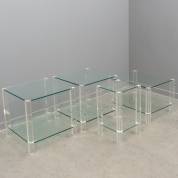 Paar bijzettafeltjes met glazen bladen en perspex poten -één poot los-, 50 × 51 × 51 cm, daarbij: twee gelijke bijzettafeltjes met afwijkende maten