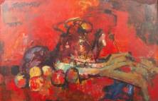 Jan Tullemans (1924-2011), geabstraheerd stilleven in rood, olieverf op paneel, l.b. gesigneerd, 78,5 × 121 cm