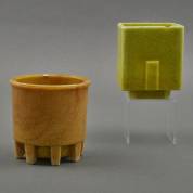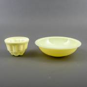 Een ronde en een vierkante gele graniver cactuspot, ontwerp Andries Dirk Copier, uitvoering Glasfabriek Leerdam -de vierkante pot met enkele chips en een haarlijn, de ronde pot met afgebroken maar gelijmd voetje-, 12,5 × 10,5 × 10,5 cm