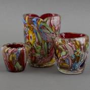 Drie veelkleurige glazen vazen met volle geabstraheerde decors, model Tutti Frutti, ontwerp Dino Martens, uitvoering Aureliano Toso, Murano, midden 20e eeuw, grootste 13 × 9,7 × 8 cm