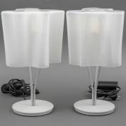 Paar tafellampen met golvende glazen kap op zilvergrijze stalen voet, model Logico Mini Tavolo, ontwerp Gerhard Reichert & Michele De Lucchi, uitvoering Artemide, Italië -één kap defect-, 43 × Ø 25 cm