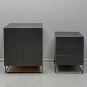 Twee zwartgelakte wandmeubels op metalen onderstellen, de een met drie lades, de ander tweedeurs, beide model Vision, ontwerp Karel Boonzaaijer, uitvoering Pastoe, jaren '80 -één lade sluit lastig, tweedeurs meubel overgelakt, kleine defecten-, afmetingen tweedeurs kastje 90 × 72 × 55 cm
