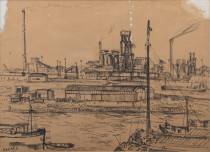 Jan Makkes (1935-1999), de hoogovens en sluis bij IJmuiden, stift op papier, l.o. gesigneerd, 52 × 73 cm, daarbij: boek over de kunstenaar