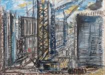 Jan Makkes (1935-1999), bouwplaats, gouache op papier, r.o. gesigneerd, 53 × 74, daarbij: publicatie over de kunstenaar