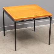 Teakgefineerde bijzettafel met zwartgelakt metalen onderstel, in de stijl van Cees Braakman voor Pastoe, jaren '70 -gebruikssporen, enkele plekjes fineerschade-, 43 × 50 × 50 cm