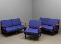 Salonset bestaande uit twee opdeelbare bankjes, en één armstoel, alle met teakhouten leuningen en blauwe bekleding, model P24 ontwerp Osvaldo Borsani, uitvoering Tecno, Italië, jaren '60/'70, 70 × 70 × 75 cm