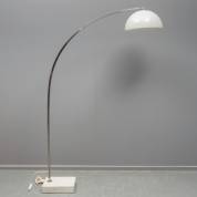 Aluminium booglamp met witte kunststof kap, op rechthoekige witmarmeren voet -gebruikssporen-, 200 × 130 × 40 cm
