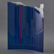 Frank van den Ham (1952), staand blauw glazen glaskunstwerk met lijnendecor en organische uitlopende bovenrand -kleine chipjes van linker- en rechter onderhoek-, 47 × 37 × 7 cm
