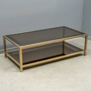 Vergulde metalen salontafel met twee rookglazen bladen, uitvoering Belgo-Chrom, België, jaren '80 -gebruikssporen, vergulding deels vervaagd, barst in hoek van onderste blad-, 130 × 70 × 36 cm