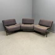 Draaibare driezitsbank met onder de buitenste delen twee hoektafeltjes en omhoogzetbare rugleuning, model Maralunga, ontwerp Vigo Magistretti, uitvoering Cassina, jaren '80 -bekleding defect-