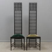 Paar zwartgelakte houten ladderstoelen met hoge rug en groene zitting, model Hill House Chair, ontwerp Charles Rennie Mackintosh, uitvoering Cassina, eind 20e eeuw, herkomst: collectie Mandemakers, 140 × 41 × 34 cm