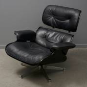 Zwartlederen fauteuil met gebogen gezwart multiplex zitting en rugleuning op verchroomd metalen draaibaar onderstel, model Original Eams Lounge Chair/M13, ontwerp Charles en Ray Eames, uitvoering Vitra, 2005, -gebruikssporen-, 80 × 85 × 90 cm