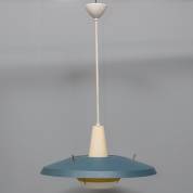 Blauwgelakte metalen hanglamp met opaline binnenkap in geelgelakt metalen montuur, model NT 25, ontwerp Louis Kalff, uitvoering Philips, jaren '50/'60 -klein chipje van glazen binnenkap-, Ø 57 cm