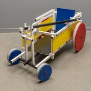 Houten bolderkar beschilderd in primaire kleuren, naar ontwerp van Gerrit Rietveld, uitvoering onbekend, eind 20e eeuw -bevestiging handvat los,- herkomst: collectie Mandemakers, 58 × 65 × 130 cm