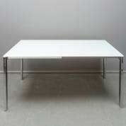 Tafel met gesatineerd glazen blad op verchroomd stalen onderstel, 73 × 160 × 90 cm, met onder het blad nog een tweede 70 cm lang blad dat na uittrekken van het onderstel tevoorschijn komt