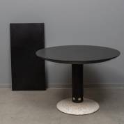 Ronde zwartgelakte schuiftafel met granito voet, inclusief één tussenblad, ontwerp Arnold Merckx, uitvoering Arco, jaren '90, 74 × Ø 105 cm