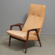 Fauteuil met afrormosia frame en geruite bekleding, model Ruster, ontwerp Yngve Ëkstrom, uitvoering Pastoe, jaren '50 -gebruikssporen-, 98 × 70 × 80 cm