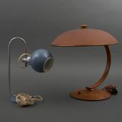 Twee bureaulampen: klein metalen exemplaar met blauwgrijs kapje, en bruin exemplaar met gebogen houten standaard, 43 × Ø 40 cm