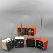 Drie kunststof uitklapbare radio's: tweemaal type TS505 en eenmaal TS502, model Cube, ontwerp Marco Zanuso en Richard Supper, uitvoering Brionvega, Italië, jaren '70/'80 -gebruikssporen, kunststof verkleurd-, 13 × 21 × 12 cm
