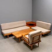 Vijfdelig teak woonkamerameubelement: driezits bank, loveseat en fauteuil met grijs geweven bekleding, salontafel en telefoon- of hoektafel, ontwerp Edvart en Tove Kindt-Larsen, uitvoering Gustav Bahus, Denemarken, jaren '60/'70 -blad van salontafel sleets, enkele losse naadjes, bekleding doorrookt-, 90 × 200 × 80 cm