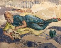 Schilderij: geabstraheerde compositie met liggende vrouw, marouflé, l.o. gemonogrammeerd E.S., 55 × 70 cm