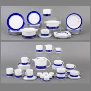Porseleinen serviesgedeelte met blauwe bies, gemerkt Thomas, Germany, bestaande uit: twee bedekte terrines, kleine bedekte terrine, sauskom, drie rechthoekige schaaltjes, zes diepe borden, vijf dinerborden, zes ontbijtborden, zes eierdoppen, theepot, zes theekopjes met vijf schotels, vier koffiekopjes met zes schotels, suikerpot, grote roomkan en kleine roomkan, dinerbord Ø 23,5 cm