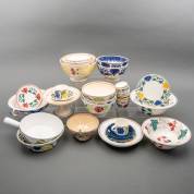 Verzameling aardewerk serviesdelen met polychrome decors, voornamelijk uitvoering Petrus Regout, Maastricht, en Arabia, Finland, grootste kom 10 × Ø 22,5 cm