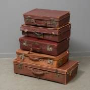 Vijf lederen koffers, diverse uitvoeringen en afmetingen, voornamelijk begin tweede helft 20e eeuw -gebruikssporen-, afmeting grootste koffer 20 × 75 × 36 cm