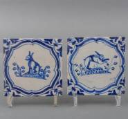 Twee Delfts aardewerk accoladetegels met blauw-wit decor: rustende en rennende haas, 17e eeuw -kleine randbeschadigingen waarvan enkele licht gerestaureerd en ingekleurd-, 13 × 13 cm
