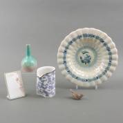 Porseleinen vaasje, het grijsblauwe decor in neriagetechniek, ontwerp en uitvoering Judith de Vries (1957), gemonogrammeerd, circa 1995, 13,5 × 9 cm, aardewerk plooischotel met decor van engel met vlag, uitvoering Makkum, Ø 32 cm, porseleinen menukaarthouder, porseleinen vogel, uitvoering Royal Copenhagen, en aardewerk steelvaasje met zeegroen glazuur, uitvoering Westraven, Utrecht, 15 cm