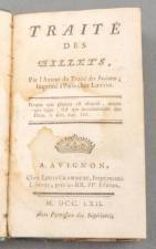 Boek: Ardène, J.-P. de Rome (1690-1769). Traité des oeillets. Par l'auteur de Traité des Jacintes. Avignon, 1762. 403 (3) pp. Kl. 8vo. Later half linnen. Met 3 uitslaande platen -versleten bandje; watervlek in eerste 50 bladen-, 14 × 8 cm