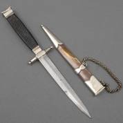 Kleine vrouwendolk, ook wel 'dague de vertu' genoemd, met zwart houten heft en metalen schede -deukjes-, Frankrijk, eind 19e eeuw, lengte 25 cm