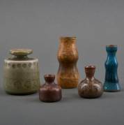 Henny Radijs (1915-1991), vier keramische miniatuurvaasjes, alle gesigneerd en gedateerd, daarbij één ander geel miniatuurvaasje, jaren '70, formaat blauw vaasje: 6 × Ø 2,5 cm
