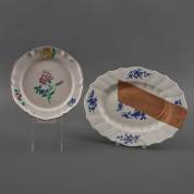 Aardewerk bord met polychroom bloemdecor, niet gemerkt, Frankrijk, 18e/19e eeuw -randchip-, en een ovale porseleinen dienschaal met blauw-wit bloemdecor, niet gemerkt, 18e eeuw, 36 × 28,5 cm, herkomst: privécollectie van kunsthandelaar Abraham van der Meer (1927-2008), destijds gevestigd op de Spiegelgracht 3 te Amsterdam