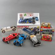 Zeven kunststof en metalen modelauto's, waaronder Tyrell P34/2, alle uitvoering Bburago, Italië, derde kwart 20e eeuw -gebruikssporen-